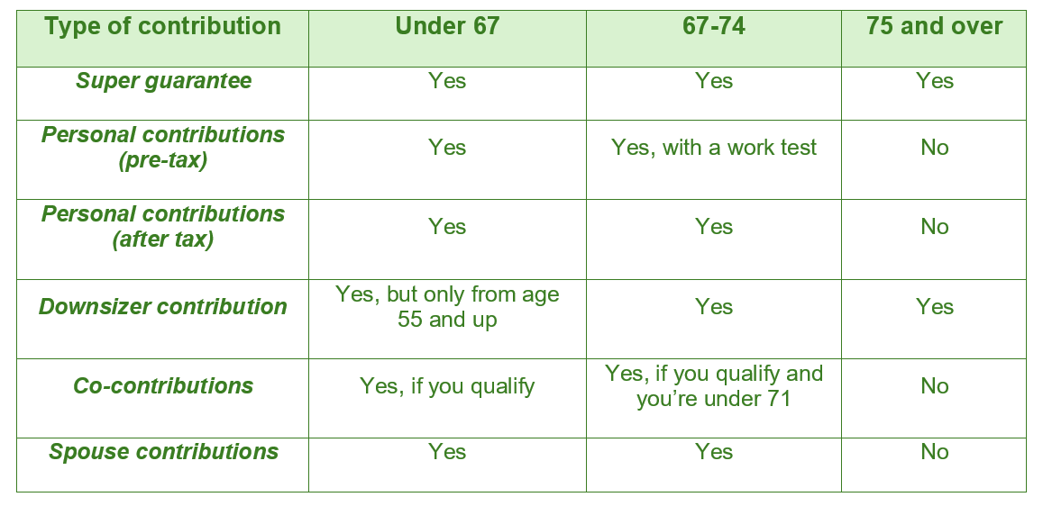 Here is a simple explanation of super contributions. Just refer to the table below for specific details and read further for a longer explanation under the age group that relates to you.